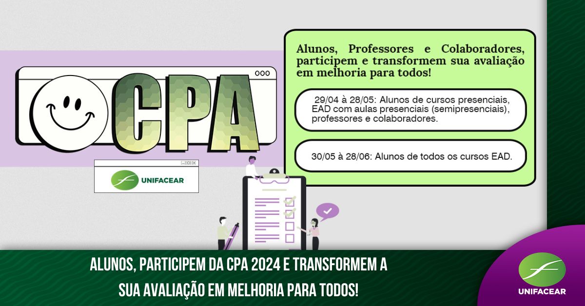 Alunos, participem da CPA 2024 e transformem a sua avaliação em melhoria para todos!