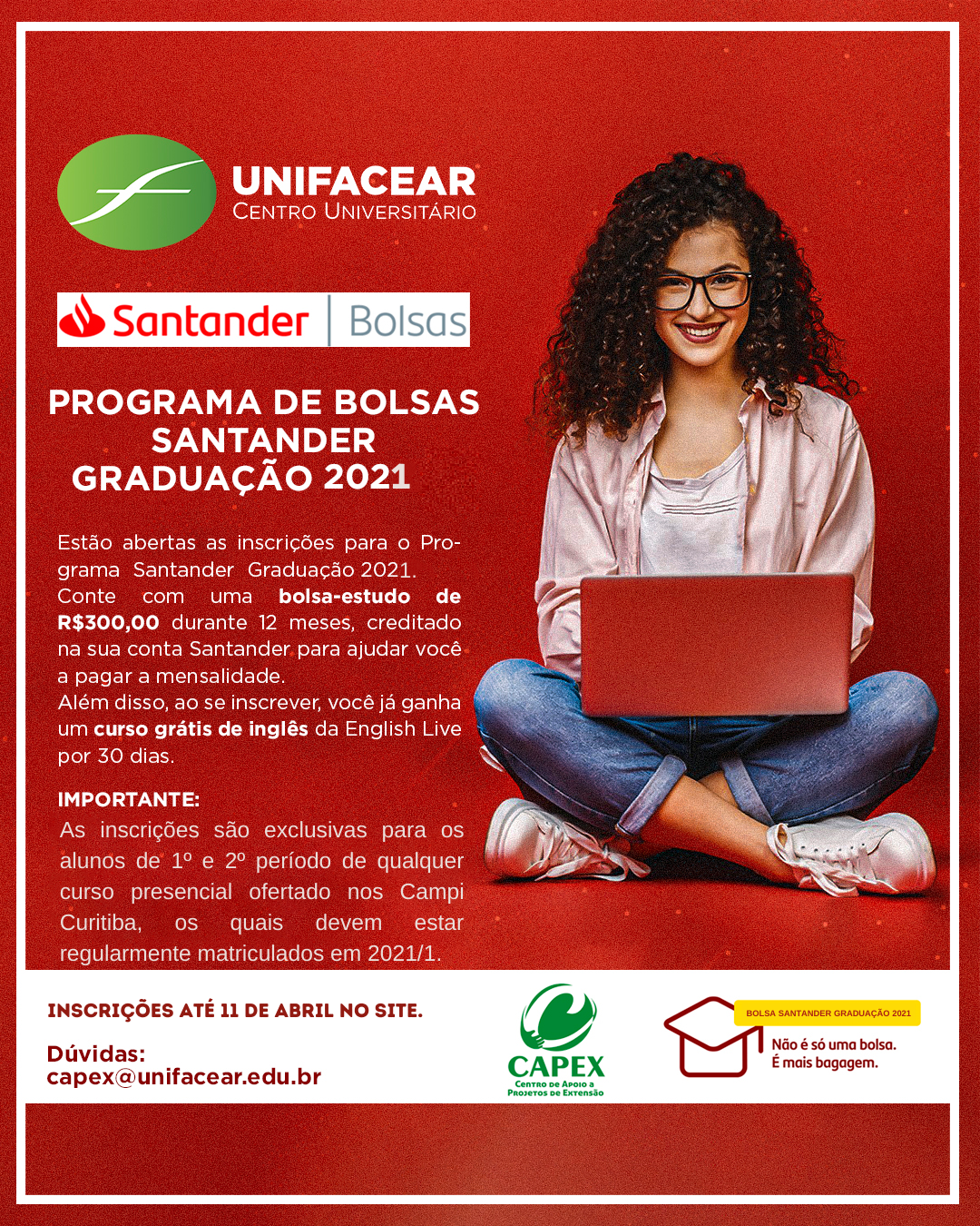 Estão abertas as inscrições para o Programa Santander Graduação 2021. Conte com uma bolsa-estudo de R$300,00 durante 12 meses, creditado na sua conta Santander para ajudar você a pagar a mensalidade.