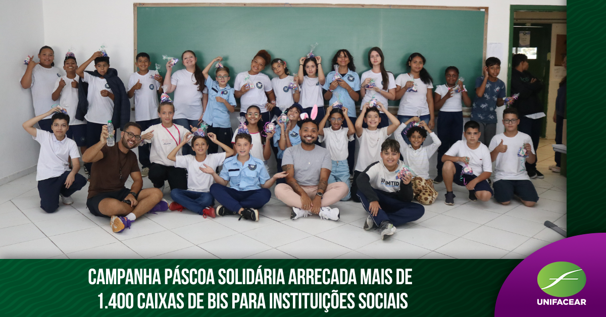 A Unifacear promoveu uma Campanha Solidária de Páscoa com o objetivo de arrecadar caixas de BIS para instituições que atendem crianças e adolescentes em situação de vulnerabilidade social. Ao todo, foram arrecadadas 1.418 caixas, resultado do engajamento da comunidade acadêmica em uma ação voltada à solidariedade e ao bem-estar social.