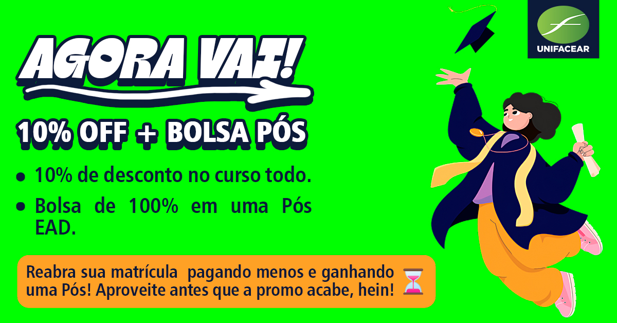 Esta promoção vale para reaberturas de matrículas realizadas entre o dia 25/01/23 e 10/02/23, dos cursos de graduação presenciais, semipresenciais e EAD da UNIFACEAR, para os campi de Araucária, Curitiba e Fazenda Rio Grande e todos os polos EAD.