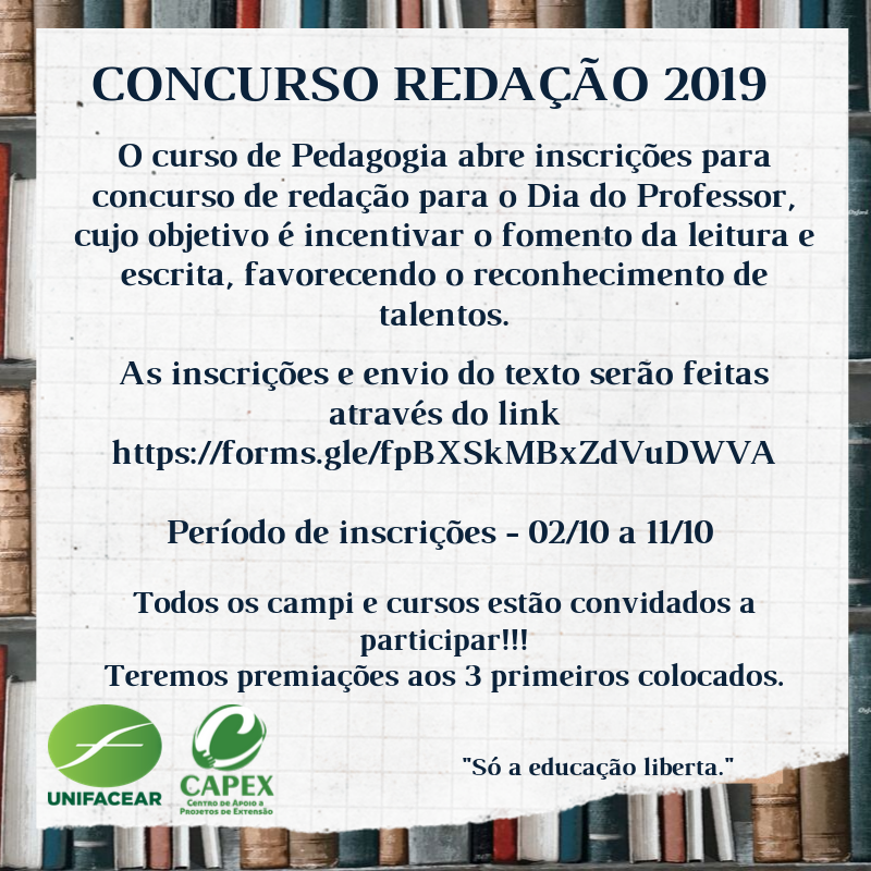 Visando incentivar esses hábitos, a Coordenação do curso de Pedagogia da Unifacear está promovendo um concurso de redação para o Dia do Professor. Através desta iniciativa, busca-se favorecer o reconhecimento de talentos da comunidade acadêmica local dos cursos presenciais, semipresenciais e a distância da Unifacear.