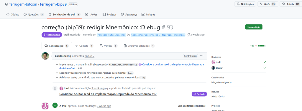 A contribuição do aluno, registrada no Pull Request nº 93 e intitulada “fix(bip39): redact Mnemonic::Debug”, foi apresentada em outubro e aprovada em novembro de 2025. A alteração impede que frases mnemônicas ou entropias completas apareçam em logs durante processos de depuração, exibindo apenas informações não sensíveis, como o idioma configurado. A medida reforça a segurança do software ao evitar vazamentos acidentais de segredos criptográficos — um risco crítico em ambientes de produção.