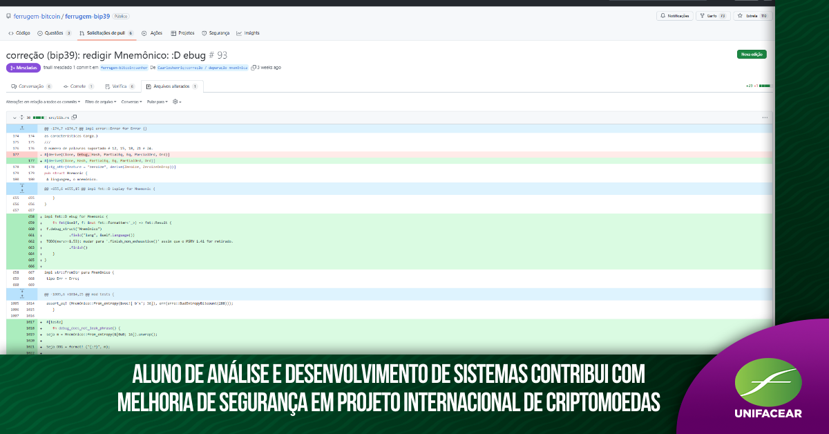 O estudante Carlos Santos, do 5º período do curso de Análise e Desenvolvimento de Sistemas da Unifacear, teve uma contribuição incorporada ao projeto rust-bip39, parte do ecossistema da organização rust-bitcoin. O projeto implementa, em linguagem Rust, o padrão BIP-39, responsável pela geração das frases mnemônicas usadas por carteiras de Bitcoin — sequências de 12 a 24 palavras que funcionam como sementes criptográficas e dão acesso às chaves privadas dos usuários.