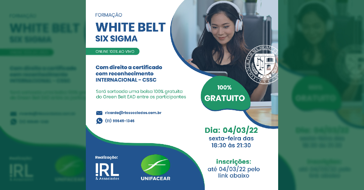 O curso de White Belt Six Sigma ocorrerá no dia 04/03/22 sexta-feira das 18:30 às 21:30 online ao vivo e totalmente GRATUITO. Certificado com reconhecimento internacional ministrado pela RL&Associados, e sorteio de uma bolsa 100% da Formação Green Belt Six Sigma entre os participantes.