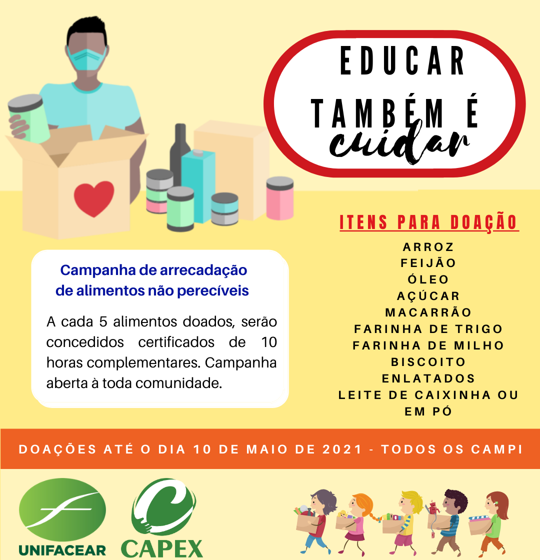 A pandemia da COVID 19 está impondo uma situação muito difícil para a nossa população, sobretudo para as famílias carentes que estão enfrentando dificuldades para o acesso à alimentação. Com isso em mente, a Unifacear está promovendo uma campanha de arrecadação de alimentos não perecíveis que serão destinados a famílias em situação de vulnerabilidade social, situadas no entorno de nossos campi.
