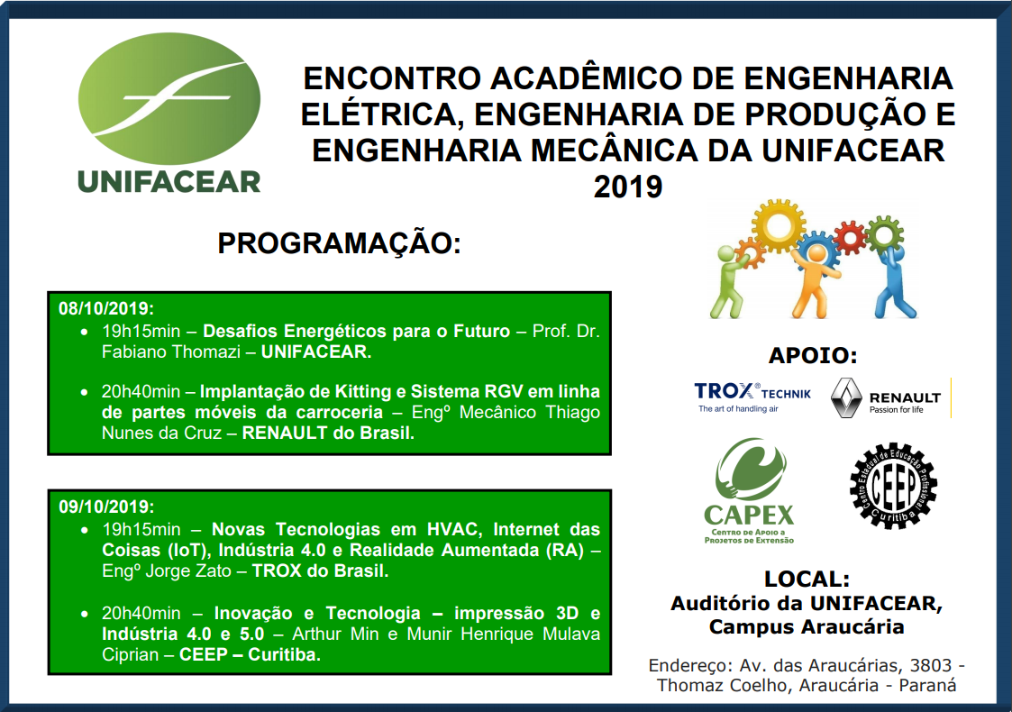 Empresas e instituições de ensino governamental marcam presença no Encontro Acadêmico de Engenharia Elétrica, Engenharia de Produção e Engenharia Mecânica da Unifacear. O evento é organizado pelas coordenações dos cursos e contará com palestras ministradas nos dias 08 e 09 de outubro.