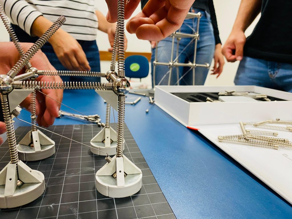 Utilizando molas e peças modulares, os estudantes puderam observar como cargas externas geram deformações e tensões e como diferentes arranjos estruturais se comportam sob o peso aplicado.
