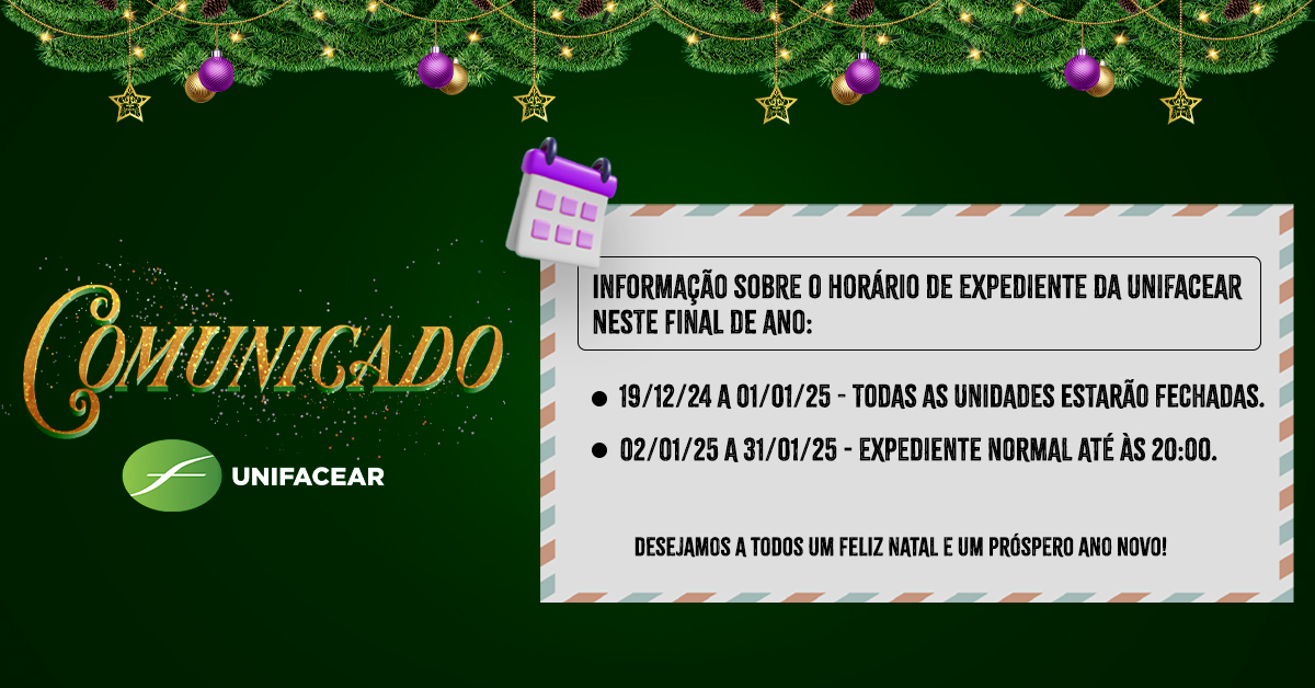 Informações sobre o expediente da Unifacear neste final de ano e para o mês de janeiro: