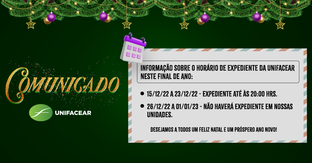 Comunicamos também que não haverá expediente em nenhuma unidade da Unifacear de 24/12/22 a 01/01/2023.