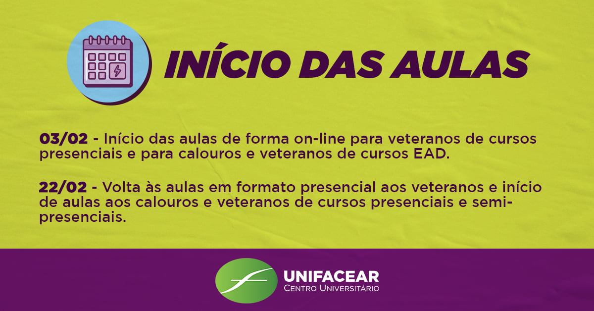 Tendo em vista que as autoridades municipais e estaduais liberaram a volta das aulas presenciais, desde que cumpridas todas as exigências sanitárias, a Unifacear vem por meio deste comunicado divulgar o seguinte calendário de aulas, referente ao primeiro semestre de 2021:
