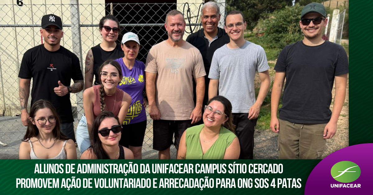Entre 31 de outubro e 30 de novembro de 2025, alunos de Administração promoveram o projeto de extensão “Gestão com Propósito: Vivências de Voluntariado em Organizações do Terceiro Setor da Região Metropolitana de Curitiba”, uma iniciativa solidária voltada à ONG SOS 4 Patas, de Campo Largo/PR.