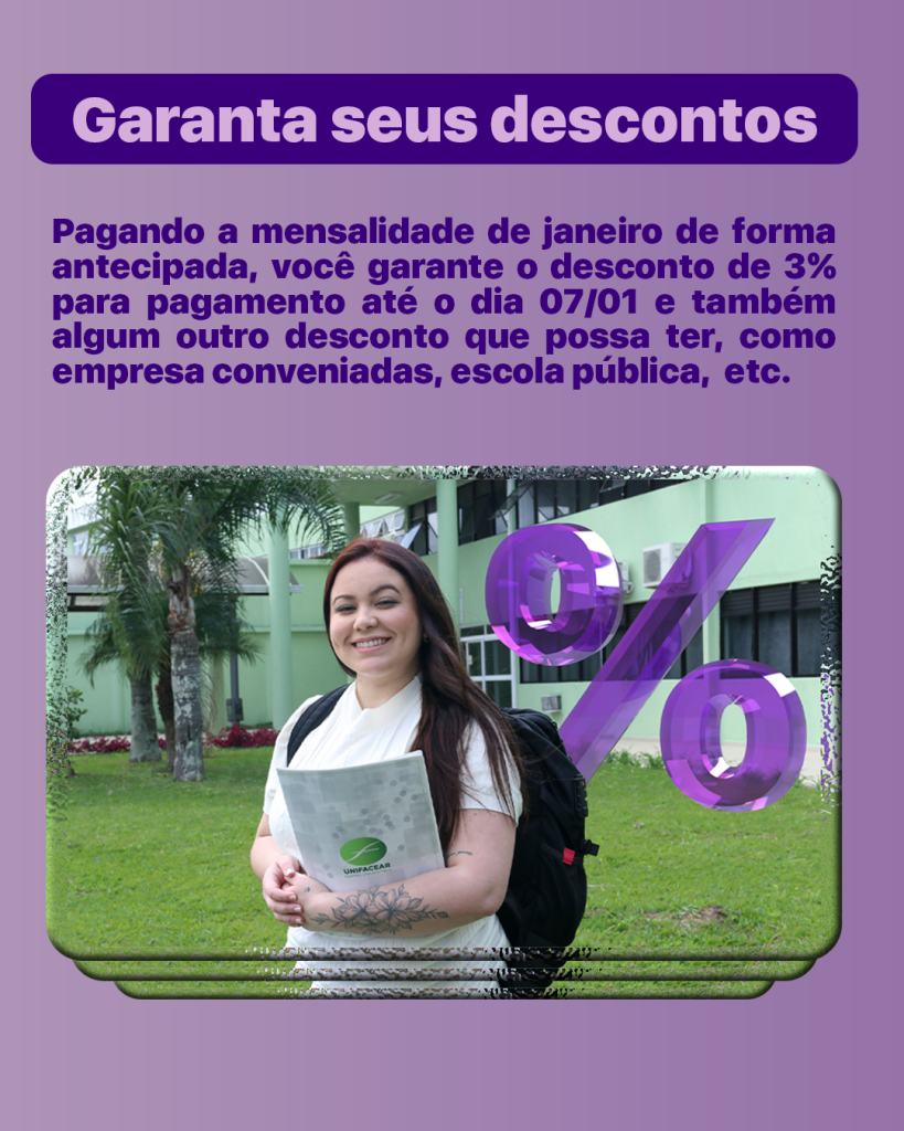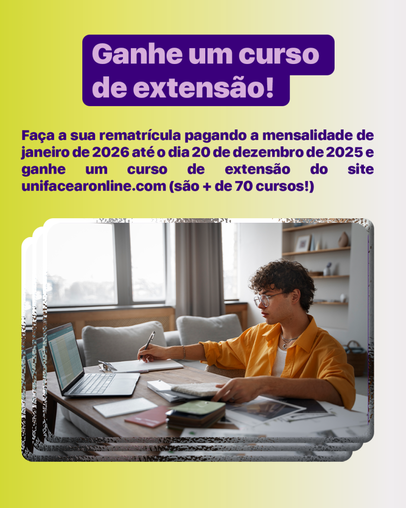 Faça a sua rematrícula antecipada realizando o pagamento da primeira mensalidade até o dia 20 de dezembro e ganhe um curso de extensão.