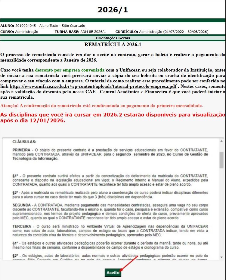 Atenção! Para realizar o processo de rematrícula é necessário dar o aceite do contrato, gerar o boleto e realizar o pagamento da mensalidade correspondente a janeiro de 2026. Somente após o pagamento da primeira mensalidade sua rematrícula será confirmada.