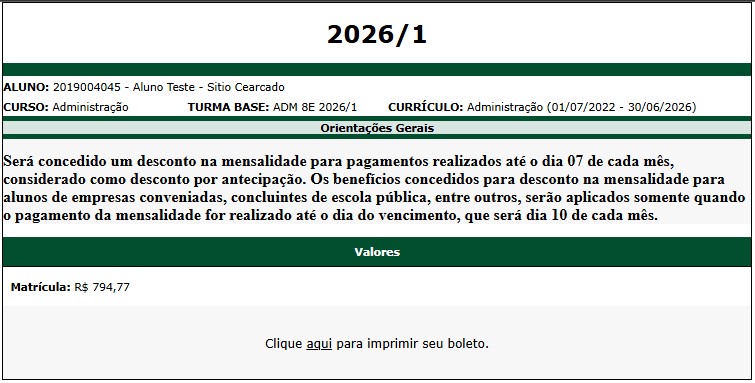 Por fim, para finalizar o processo e assim confirmar a rematrícula, basta efetuar o pagamento do boleto correspondente a mensalidade de janeiro de 2025.
