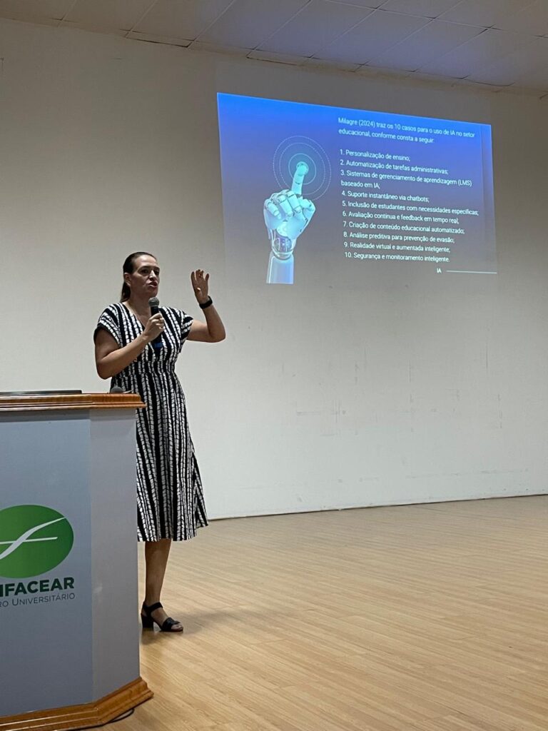 Realizada no auditório do campus, a palestra teve início às 19h30 e abordou o tema "O Futuro da Educação e o Impacto da Tecnologia". A apresentação da convidada foi conduzida pelo coordenador geral Fernando Bonato. Durante sua exposição, Claudia Leticia Filla discutiu as transformações que a tecnologia tem proporcionado no cenário educacional, além das perspectivas para o futuro da aprendizagem. O momento foi de reflexão e aprendizado, incentivando os participantes a se adaptarem às novas ferramentas tecnológicas para aprimorar a qualidade da educação.
