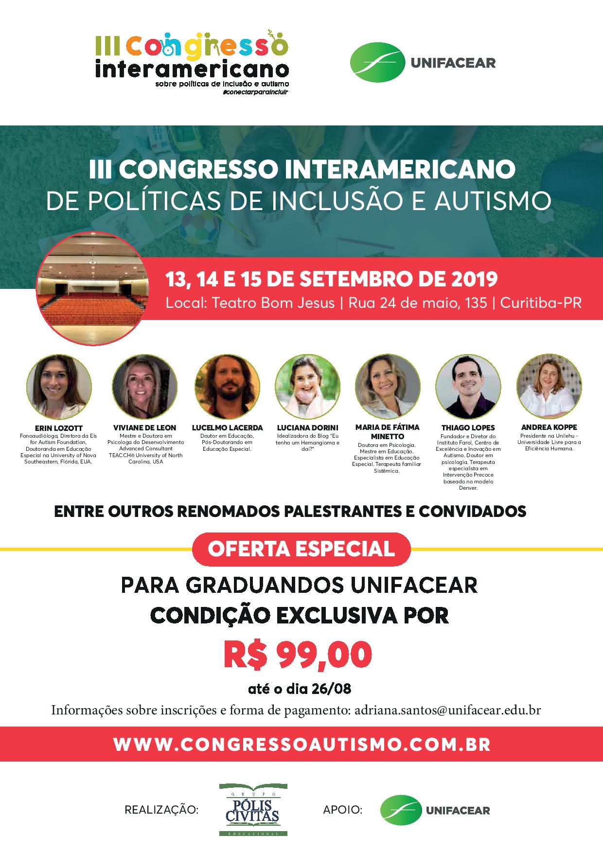 A Unifacear, em parceria com o Grupo Educacional Pólis Cívitas, apoia a terceira edição do Congresso Interamericano de Políticas de Inclusão e Autismo, que acontecerá nos dias 13, 14 e 15 de setembro no Teatro Bom Jesus.