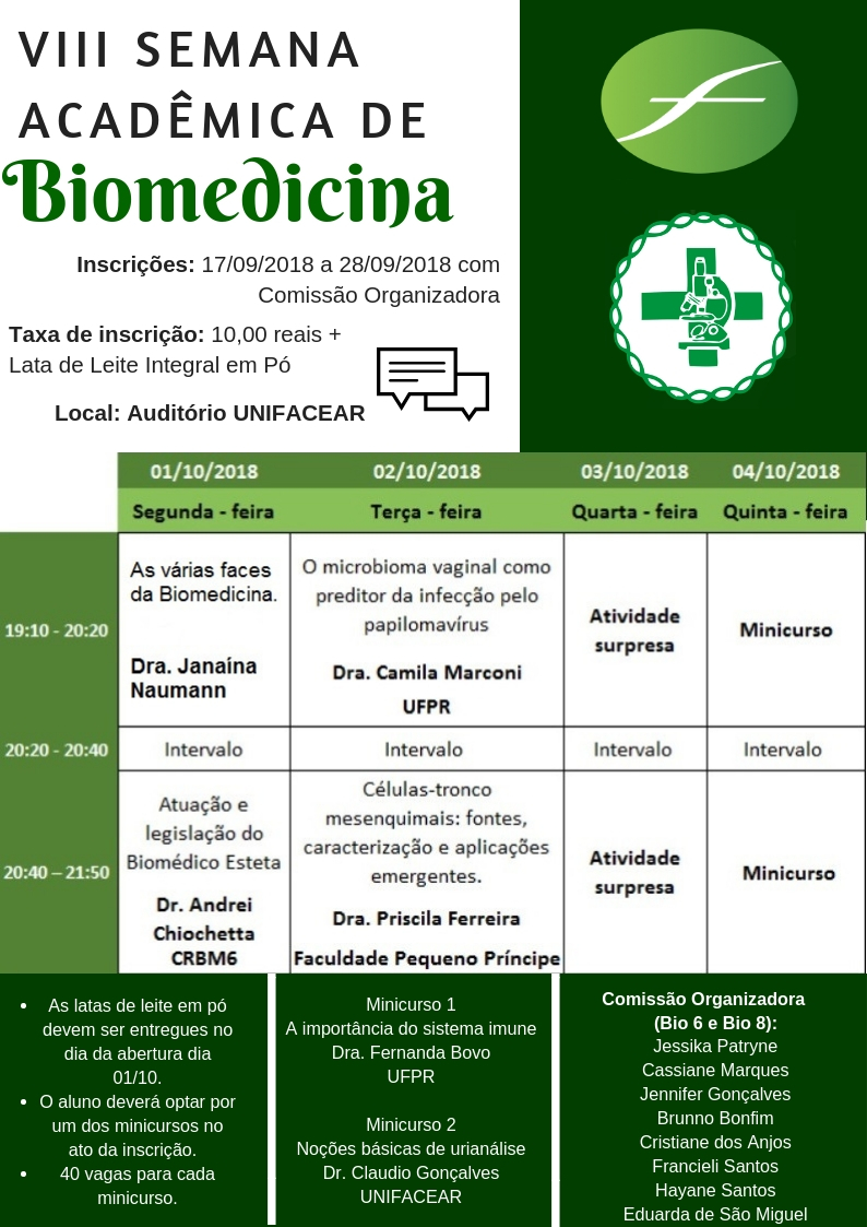 A UNIFACEAR, a Comissão Organizadora e a Coordenação do Curso de Biomedicina convidam a todos para a VIII Semana Acadêmica da Biomedicina, um evento que ocorre anualmente no curso de Biomedicina na UNIFACEAR.