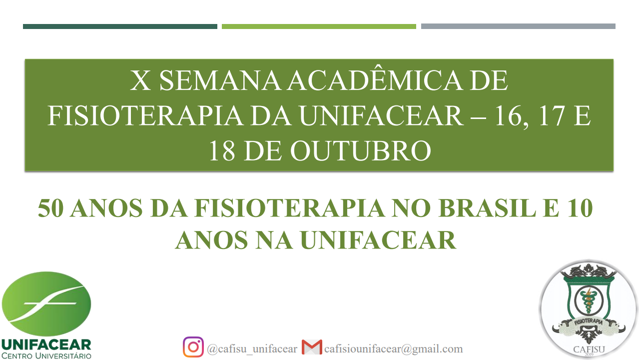 Para comemorar os 50 anos da regulamentação da Fisioterapia e da Terapia Ocupacional no Brasil e os 10 anos do curso de Fisioterapia da Unifacear, a coordenação realizará a X Semana Acadêmica.